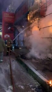 أخمد عناصر الدفاع المدني النيران التي اندلعت في الواجهة الأمامية التي وضعت أمام محال “خوري هوم” في منطقة الدورة، كزينة للأعياد.