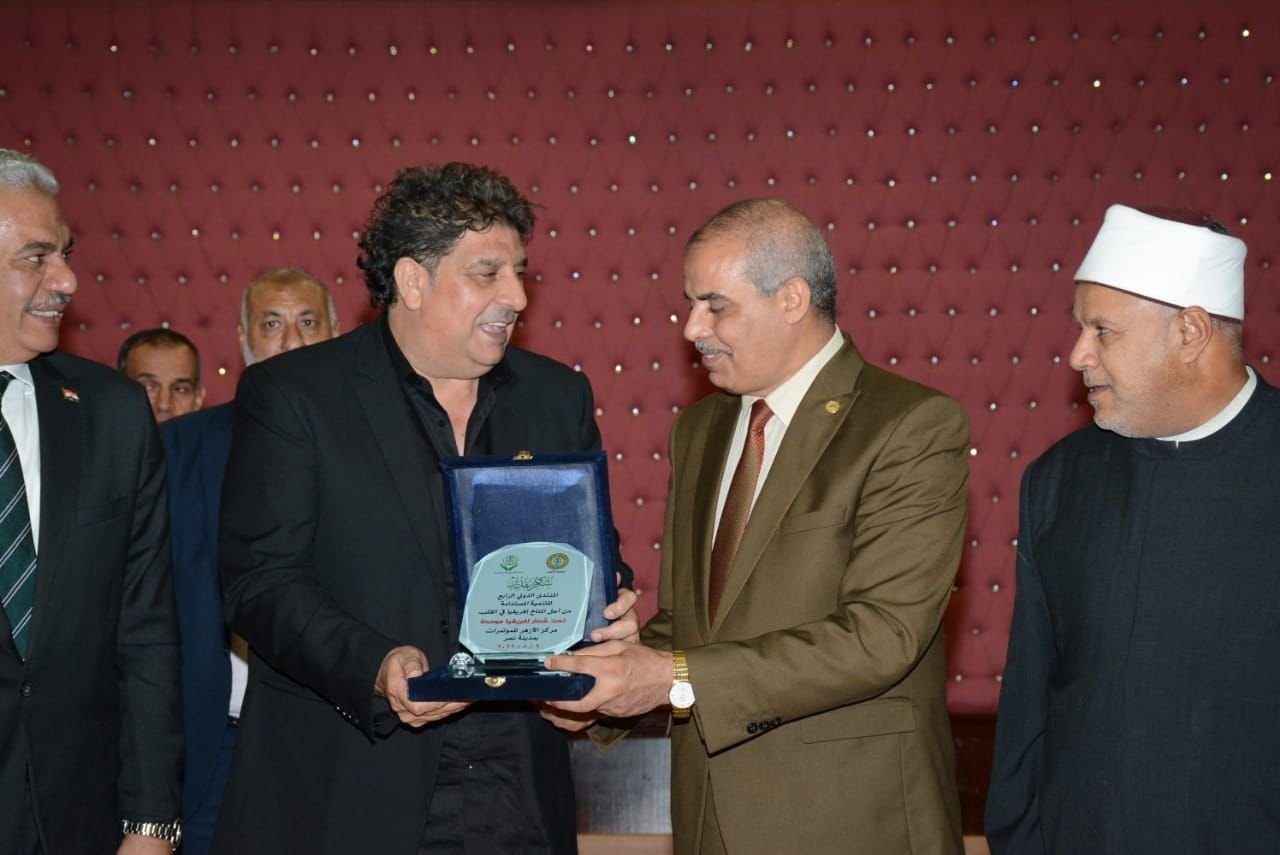 كَرم أ.د/ محمد حسين المحرصاوي رئيس جامعة الأزهر، الدكتور/ بسام فرشوخ رئيس الاتحاد العربي لتنمية الصادرات والصناعات الجلدية، على هامش المنتدى الدولي للطلاب بعنوان من أجل المُناخ (افريقيا في القلب) بحضور سعادة الوزير المفوض/ محمد خير مدير إدارة المنظمات والاتحادات العربية بجامعة الدول العربية وبمشاركة مجموعة من الوزراء والسفراء المعنيين.